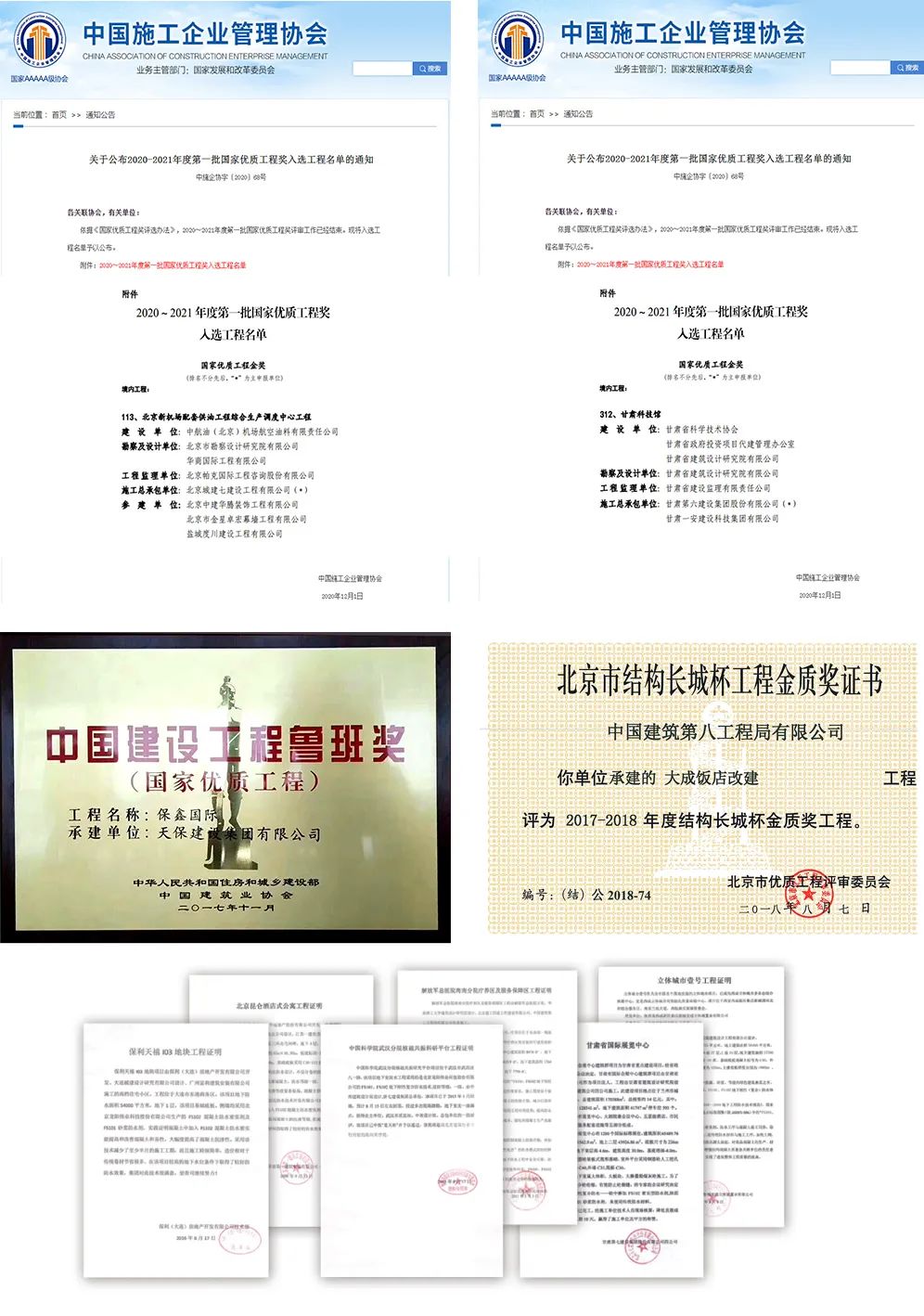 项目类型涵盖“民用住宅、商业综合体、市政管廊、道桥、地铁、医院、体育馆、学校以及水利项目”等,其中多个项目获得鲁班奖、国家优质工程奖及地方质量奖项。